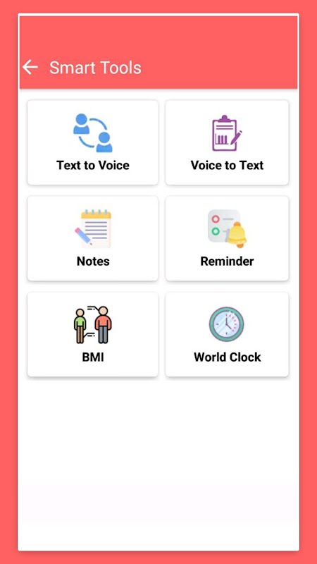 7) اسمارٹ ٹولز - آواز سے متن ، متن کو آواز ، نوٹ ، یاد دہانی ، BMI اور عالمی گھڑی