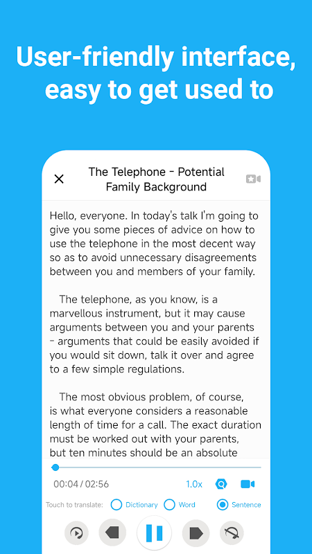 سننے کا سب سے اہم ہنر انگریزی میں ہے۔ یہ سافٹ ویئر آپ کو انگریزی سننے میں آسانی سے عمل کرنے میں مدد دے گا۔ گفتگو سے آواز کافی آہستہ ہے۔ لہذا ، آپ گفتگو میں تقریبا الفاظ سن سکتے ہیں۔