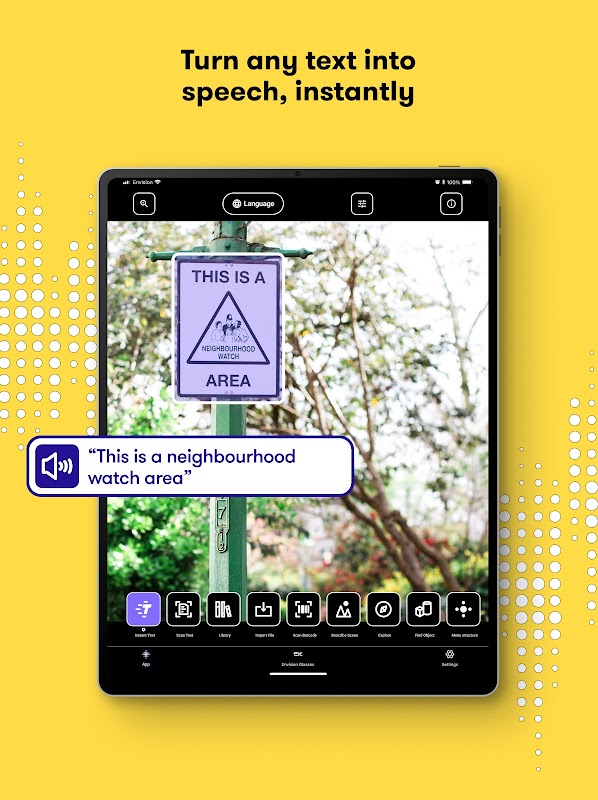 کسی بھی متن کے ٹکڑے کو اسکین کرنے کے لیے بس اپنے فون کے کیمرہ کا استعمال کریں، آپ کا ماحول، اشیاء، لوگوں یا پروڈکٹس اور ہر چیز آپ کو پڑھ کر سنائی جائے گی Envision کی سمارٹ آرٹیفیشل انٹیلی جنس (AI) اور آپٹیکل کریکٹر ریکگنیشن (OCR) کی بدولت۔