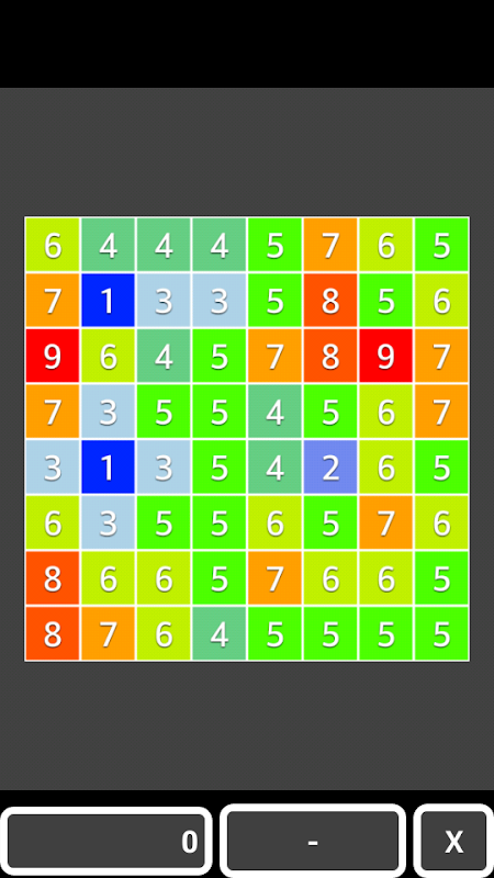 At the start of the game board is filled with random numbers from 1 to 9 and the corresponding colors which looks similar to a geographic physical map (colors from blue through green to red). During the game the player pressed fields on the board to increase or decrease their value. After pressing a particular field, the value in this field is increased or decreased by 2, and the values of the four directly adjacent fields are incremented or decremented by 1 (depending on the choice on the button under the board - "+" or "-"). The game ends when all fields on the board are set to number 5. During the game player's moves are counted and are visible below the board.