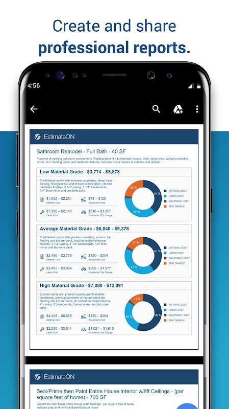 ایڈریس اور پروجیکٹ کی قسم درج کریں۔ تخمینہ ایک مکمل تخمینہ تیار کرتا ہے ، جس میں مواد اور مزدوری کے اخراجات شامل ہیں۔ ایکسٹ ویئر کے باقاعدگی سے اپڈیٹ شدہ میٹریل ، لیبر ، اور سامان لاگت کی تحقیقات کے ذریعہ تقویت یافتہ ، ہر اندازہ موجودہ اور مقامی ہے۔