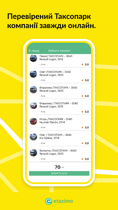 Etaximo ایپ کا استعمال کرتے ہوئے آپ صرف کسی ڈرائیور سے آنکھیں بند کرکے درخواست نہیں کرتے ہیں، بلکہ آپ اپنے اردگرد دستیاب ڈرائیوروں میں سے ایک شعوری انتخاب کرتے ہیں۔ آپ کو منتخب کرنے کے لیے ڈرائیور کی درج ذیل خصوصیات ہیں: