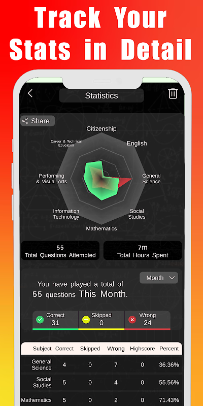 📊 تفصیلی اعدادوشمار کا ڈیش بورڈ - ریڈار چارٹس میں موضوع کے لحاظ سے درست، غلط اور چھوڑے گئے جوابات دیکھیں۔ روزانہ، ہفتہ وار، ماہانہ یا مجموعی طور پر کھیلے جانے والے کوئزز کو ٹریک کریں۔ دیکھیں کہ آپ نے سیکھنے میں کتنے گھنٹے گزارے ہیں۔