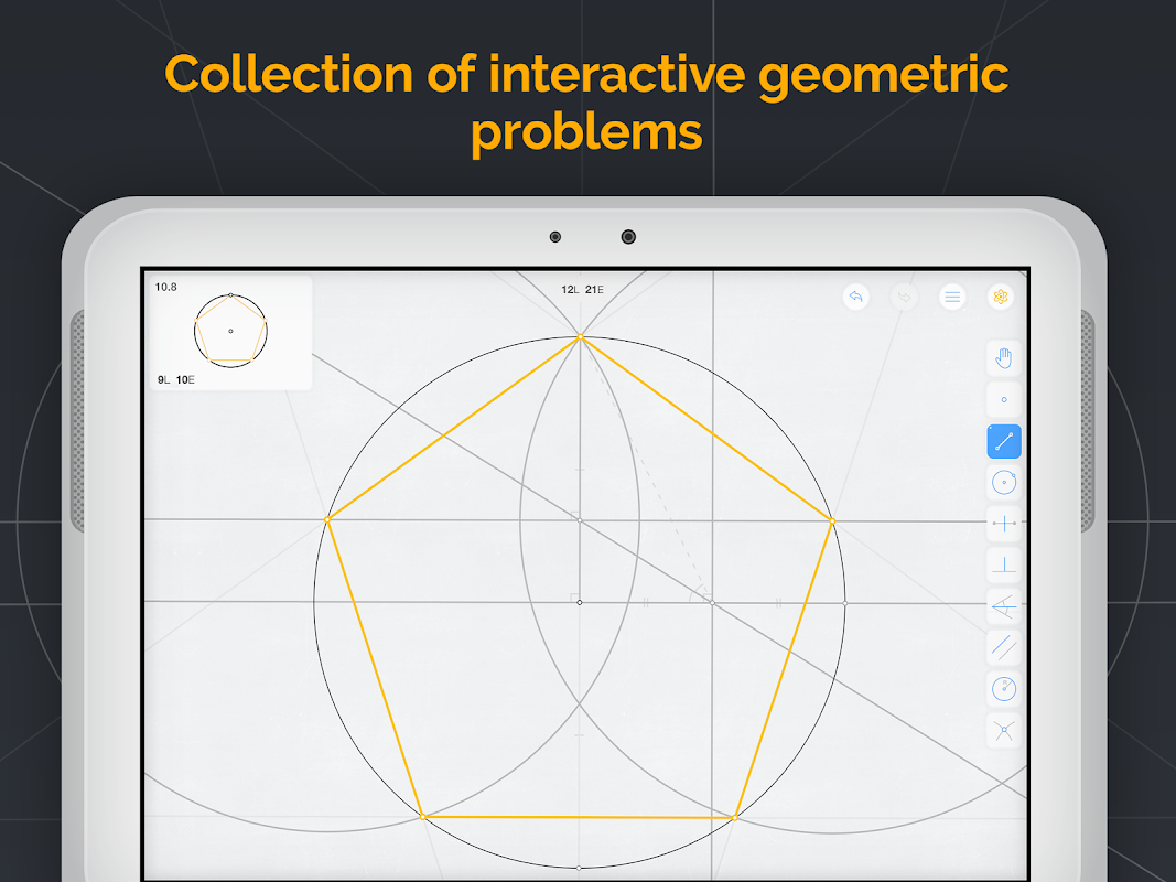یوکلیڈیا یوکلڈیا تعمیرات کے بارے میں جاننے ، دریافت کرنے اور لطف اٹھانے کا ایک شاندار اصل طریقہ ہے! آپ کا کام اسٹریٹج اور کمپاس کے ذریعہ جیومیٹرک تعمیرات کرکے دلچسپ چیلنجوں کو حل کرنا ہے۔ اگر آپ کم سے کم چالوں میں انتہائی خوبصورت طریقے سے حل حل کرتے ہیں تو آپ زیادہ سے زیادہ اسکور حاصل کرسکیں گے۔ حل لائنوں (ایل) اور ابتدائی یکلیڈین تعمیرات (E) میں بنائے جاتے ہیں۔