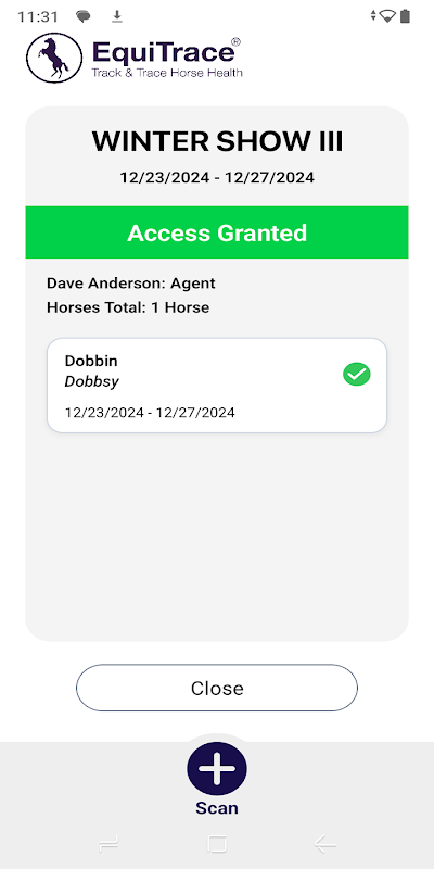 یہ ایپ EquiTrace سے EventPass پیشکش کا حصہ ہے۔ یہ شو کے منتظمین کو حریفوں کے ایونٹ پاسز کو اسکین کرنے کی اجازت دیتا ہے، اس بات کی تصدیق کرنے کے لیے کہ شو کی صحت کی تمام ضروریات پوری ہو گئی ہیں۔