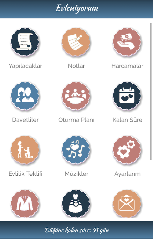 'Evleniyorum' uygulaması, evlilik sürecinizi tek bir yerden yönetmenizi sağlayan bir yardımcıdır. Notlarınız, masraflarınız, davetli listeniz, düğün oturma planınız, evliliğe kalan süreniz, seçilmiş evlilik teklifleri, dans müzikleri ve daha neler neler ...