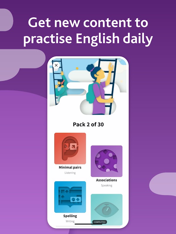 ہر سیشن انگریزی میں پڑھنے ، سننے ، لکھنے اور بولنے کے لیے دلچسپ ، مہارت پر مبنی سرگرمیاں مہیا کرتا ہے اور دن میں کم سے کم 10 منٹ لیتا ہے۔