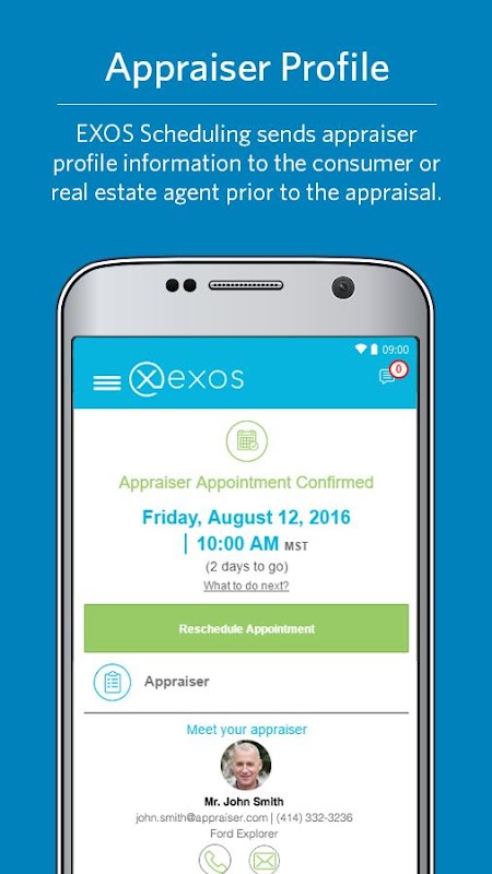 o EXOS شیڈولنگ تشخیصی تقرری سے قبل صارف یا رئیل اسٹیٹ ایجنٹ کو تشخیص کنندہ پروفائل کی معلومات بھیجتا ہے ، جس سے وہ تشریف لانے والے کی شناخت کی تصدیق کرنے کی اجازت دیتا ہے۔