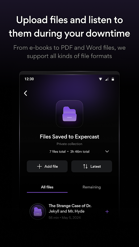 فائلوں کو Expercast میں محفوظ کریں اور اپنے ڈاؤن ٹائم کے دوران انہیں سنیں۔ ہم پی ڈی ایف فائلوں، ورڈ دستاویزات، EPUB فائلوں، اور مزید کو سپورٹ کرتے ہیں۔
