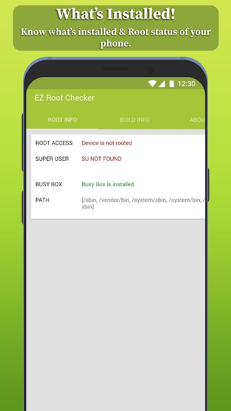 Got Root or Custom Rom with root access? EZ Root Checker will let you know if your smartphone is rooted for root access and custom rom or custom recovery installation or not. EZ Root Checker - Busybox verification & System info check is a multi-purpose app that will help you to: