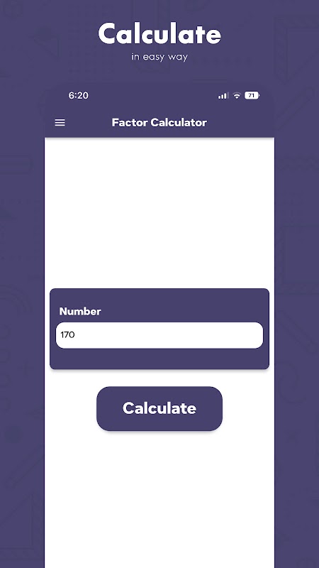 حل کے ساتھ فیکٹر کیلکولیٹر آپ کو دی گئی قدر کے تمام عوامل کا حساب لگانے اور تلاش کرنے کے قابل بناتا ہے۔ آپ کو صرف خالی خانے میں کوئی بھی نمبر داخل کرنے کی ضرورت ہے۔ کیلکولیٹر بٹن پر ٹیپ کریں اور یہ کیلکولیٹر اس نمبر کے تمام فیکٹرز دکھائے گا۔