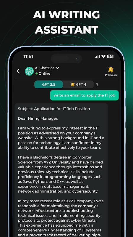 AI چیٹ بوٹ ChatGPT-3.5 اور ChatGPT-4 کے ذریعے تقویت یافتہ ہے۔ چیٹ AI اسسٹنٹ سے کچھ بھی پوچھیں۔