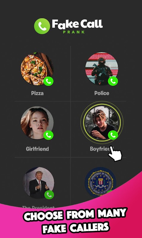 - بہت سے جعلی کال کے اختیارات کی فہرست میں سے اپنے پسندیدہ مذاق کا انتخاب کریں - جیسے گرل فرینڈ، پولیس، پیزا