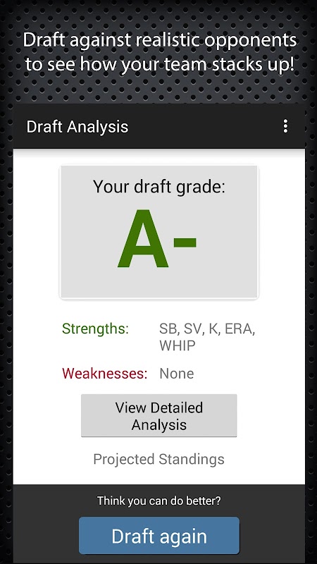 ● Post-draft grading: the sophisticated team analysis algorithm will let you know how you stack up against the other teams in your mock draft.