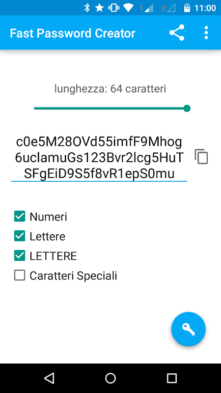 Fast Password Generator ti permette di generare password da 4 a 64 caratteri composte da numeri, lettere e caratteri speciali in un istante!