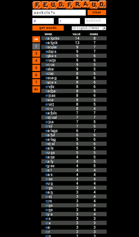 When you are lacking a little inspiration or when you're dealt really lousy tiles, Feudfraud helps you find the longest, the smartest and the most valuable words in UK English (SOWPODS), US English (TW06), Dutch, Swedish, Norwegian, Danish, French, Spanish and German.