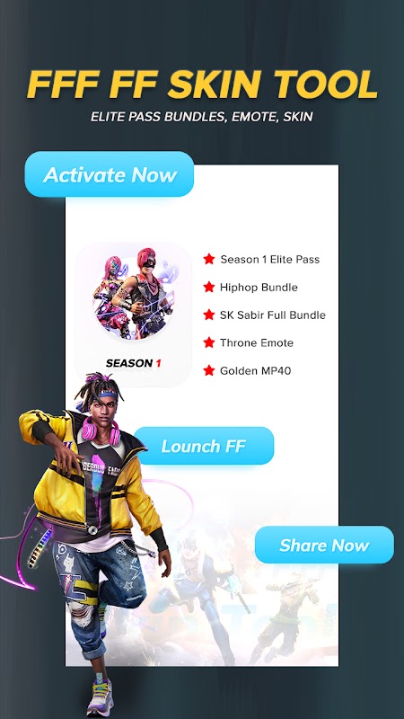 FFF FF Skin Tool is a simple app that allows users to entertain by getting Elite Pass Bundles, Emotes & Gun Skins for entertainment. This unlimited free Diamond earning app is easy to use and you can get elite pass & diamonds. We made free diamonds giveaways on daily basis.