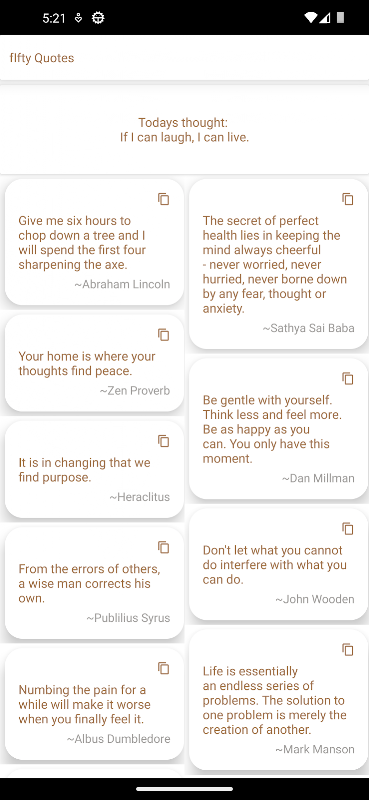 "ففٹی کوٹس" ایک طاقتور اینڈرائیڈ ایپ ہے جو ہر روز 50 فکر انگیز اقتباسات کا تازہ مجموعہ پیش کرتی ہے۔ اپنے حوصلے بلند کرنے اور اپنے نقطہ نظر کو وسیع کرنے کے لیے الہام، حکمت اور ترغیب کے ایک چشمے میں غوطہ لگائیں۔ ایک سادہ انٹرفیس اور روزانہ کی تازہ کاریوں کے ساتھ، اپنی انگلی پر مختصر الفاظ کی تبدیلی کی طاقت دریافت کریں۔