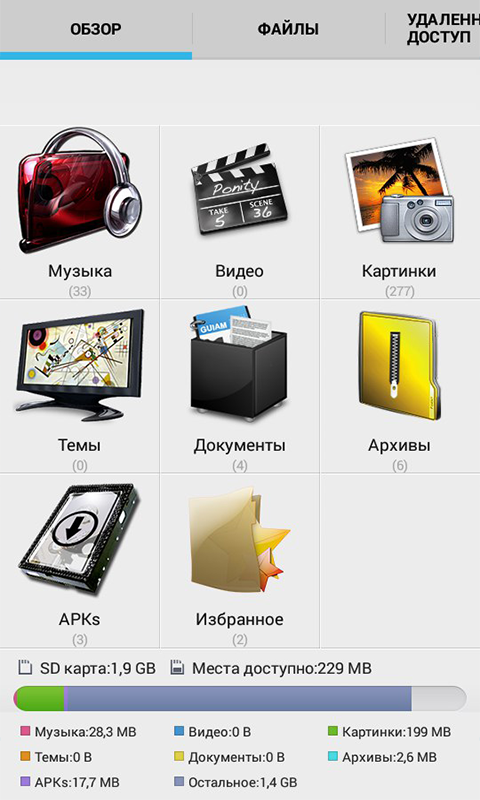 One of the best file manager for Android. All the files on your SD-card he categorizes that facilitates access to the desired content, without having to search for it on the folder manually. You can browse music files, videos, photos, documents, applications, as well as easy to copy, move, delete or upload new files from your PC to your smartphone or tablet via Wi-fi connection.