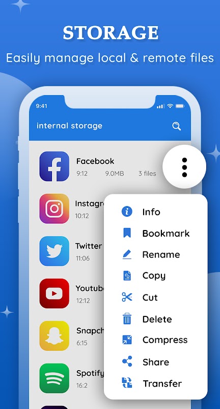 Transfer content, copy/paste, compress, unzip, delete, and move files, as well as extracting ZIP, RAR, BIN, TAR & APK files, between local drive, external storage and cloud storage.