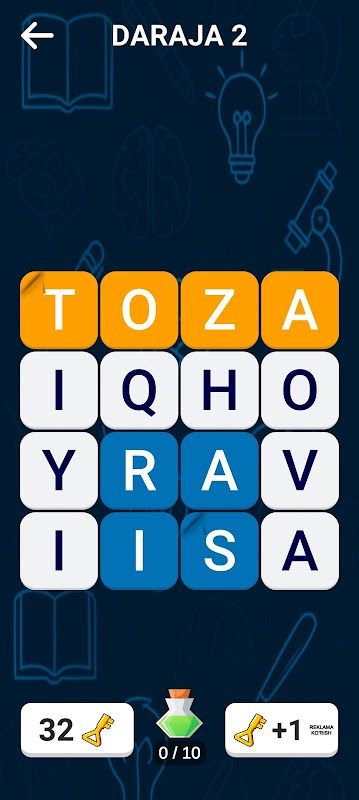 Bizning oʻyinimiz oʻzbek tilidagi 8000 dan ortiq noyob va takrorlanmas soʻzlarni oʻz ichiga oladi. Bu degani – sizni oylab, hatto yillab davom etadigan qiziqarli boshqotirmalar kutmoqda! کنڈلک سوزلرڈن ٹورٹیب، ادبیوت وا فنڈا اچرایڈگن نووب اتملاریگچہ – ہر بیر دراجہ سیز اچون یانگلک اوچادی۔ Endi siz hech qachon bir xil, takrorlanadigan darajalarga duch kelmaysiz. ہر بیر یانگی اوین – بو یانگی بلیم وا یانگی ہسیوٹلر!