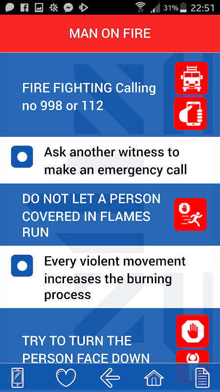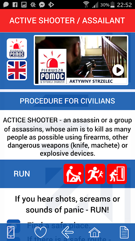 ہم آپ کو اس مفت ایپلیکیشن کو استعمال کرنے کی دعوت دیتے ہیں جو کہ ابتدائی طبی امداد اور بہت سی دوسری ریسکیو سرگرمیوں کے میدان میں علم کا ایک مجموعہ ہے۔ یہ ایپلیکیشن پولیس اہلکاروں، پیرامیڈیکس، فائر فائٹرز اور اے بی ڈبلیو افسران نے تیار کی تھی۔ آپ کو ابتدائی طبی امداد، بچاؤ کے حالات اور کارڈیو پلمونری ریسیسیٹیشن اسسٹنٹ کے دہشت گردی کے خطرات، لوکیٹر، ایمرجنسی نمبرز کی مکمل رینج، ہدایاتی ویڈیوز اور بہت سے دوسرے مفید مسائل کے الگورتھم ملیں گے۔