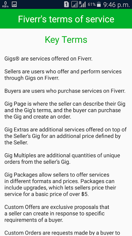 The following terms and conditions will give you exact rules and regulation about fiverr.