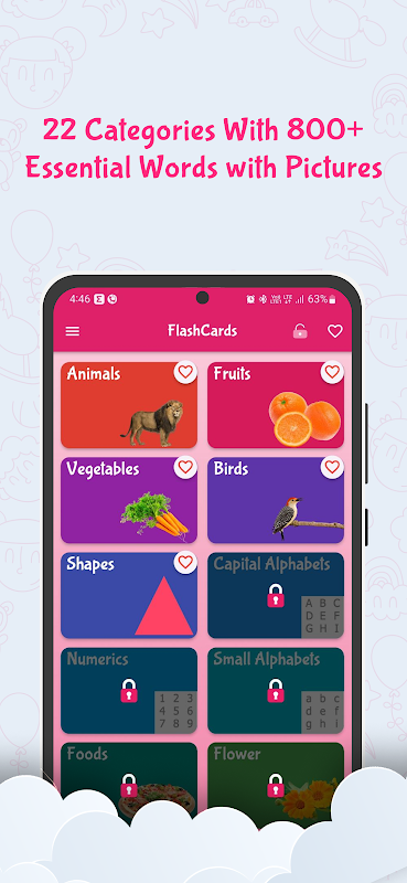 ایپ میں جانوروں، پھلوں، سبزیوں، شکلوں، پرندوں اور بہت سی چیزوں جیسے مختلف زمروں کا احاطہ کیا گیا ہے۔ یہ قسم اس بات کو یقینی بناتی ہے کہ بچے مسلسل نئے الفاظ اور خیالات سے روشناس ہوں۔