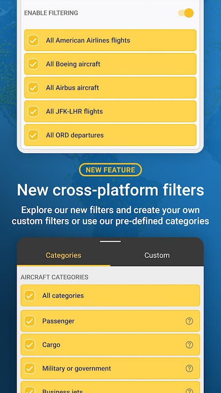 - ایئر لائن، ہوائی جہاز، اونچائی، رفتار، اور مزید کے لحاظ سے پروازوں کو فلٹر کریں۔