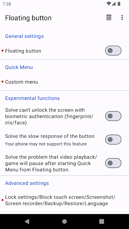 - جب اسکرین فل سکرین موڈ میں ہو یا منتخب ایپلیکیشن پیش منظر میں ہو تو خود بخود تیرتے ہوئے بٹن کو دکھائیں/چھپائیں