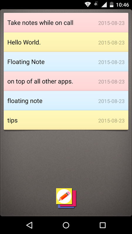 Floating Note that stay on top of all other apps is a floating note or tips app! Easily dock them to the left side to keep your screen real-estate at full potential. Useful for quick note taking and keep all you need to remind accessible. You can have your notes visible or docked while you do other tasks. Closing a note will auto-saved, and see them in the note list page. you can edit\delete\share note in the note list. All stickies are auto-saved! Floating Note is also a notepad \ tips app.