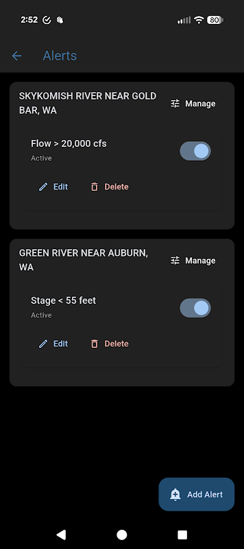 جب آپ کا گیج آپ کے طے شدہ معیار پر پورا اترتا ہے تو خود کو مطلع کرنے کے لیے الرٹس شامل کریں۔ ہر پسندیدہ گیج کے لیے متعدد الرٹس سیٹ کیے جا سکتے ہیں۔ ایک اسکرین میں تمام گیجز کے لیے اپنے الرٹس کا نظم کریں۔