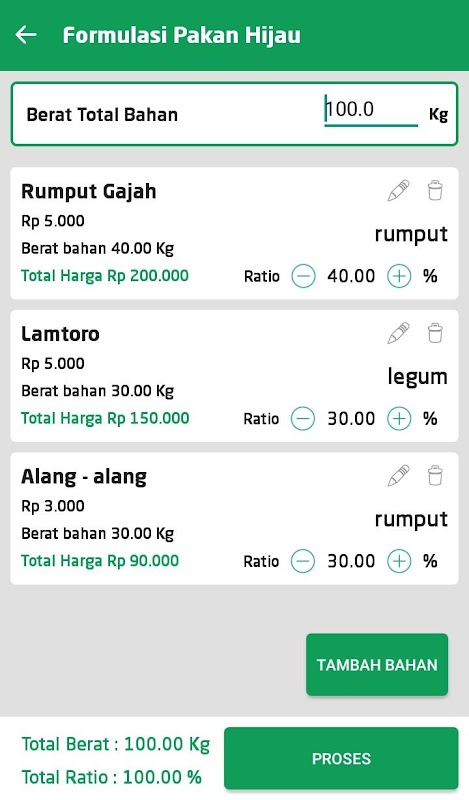 Komponen-komponen yang digunakan sebagai dasar perhitungannya, dapat disesuaikan dengan kondisi dimana pengguna berada. Misalnya pada kandungan nutrisi, pengguna bisa memilih apakah dengan nilai standar, atau sesuai analisa laboratorium yg dimiliki.