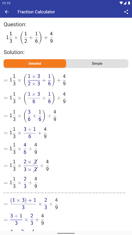 ✓ بنیادی کسر کے حساب کتاب کے لیے مرحلہ وار تفصیلی حل حاصل کریں۔