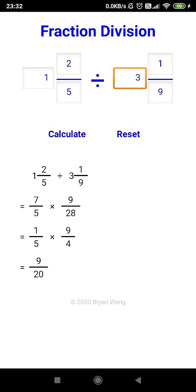 This app shows how to perform division between two fractions (or mixed numbers) step by step. In general, it involves convert any mixed number to improper fraction, rewrite division to multiply by the reciprocal of the divisor, reduce and then multiply. The answer will be expressed in the simplest form.