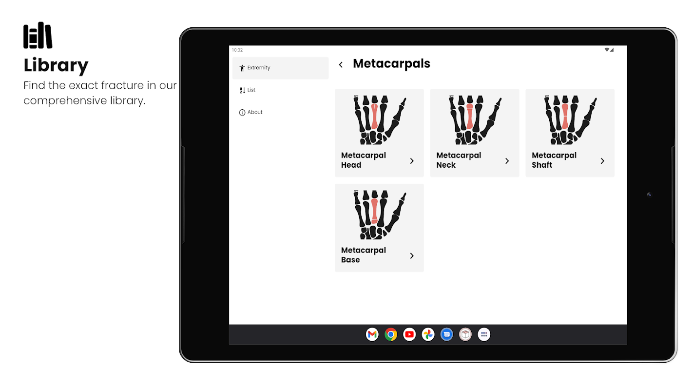 - استعمال میں آسان انٹرفیس: زخمی علاقے کو منتخب کرنے اور فریکچر کا انتخاب حاصل کرنے کے لیے ہمارے ہڈی کا نقشہ استعمال کریں۔ آپ صرف ایک مطلوبہ الفاظ کے ساتھ ایک جامع فہرست کے ذریعے بھی تلاش کر سکتے ہیں۔