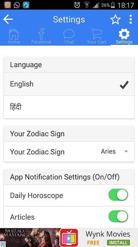 दैनिक हिन्दी राशिफल हिन्दी और अंग्रेजी दोनो भाषाओ मे है। आप सेटिंग मे जाकर् भाषा बदल सकते है।