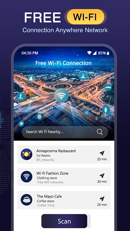 Free WIFI Connection Manager Anywhere Network Map will find hotspot Wi-Fi open network and free auto connect faster, find access and manage connection networks around you. Wi-Fi map scanners with detailed list of available networks you can connect open free Wi-Fi anywhere anytime everywhere on the go.