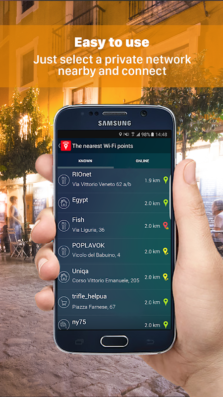 ► Installing Wi-Fi Space on your Android phone or tablet you will get a current map and select a suitable wifi hotspot for Android. The principle is very easy: you see the closest access points and may use any root to be connected. You will see your current location on a map and an image of wifi hotspots around you.