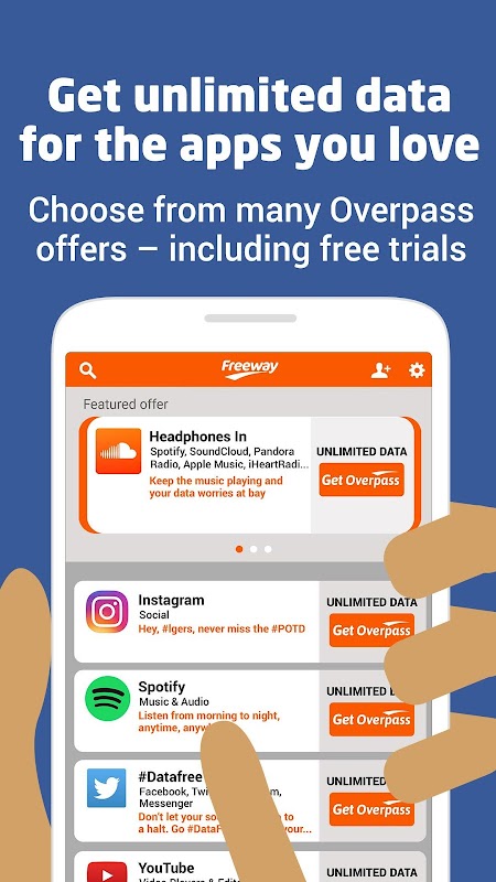 Freeway Overpass™ gives you the flexibility to live beyond your data plan with sponsored offers and unlimited data for the apps you love.