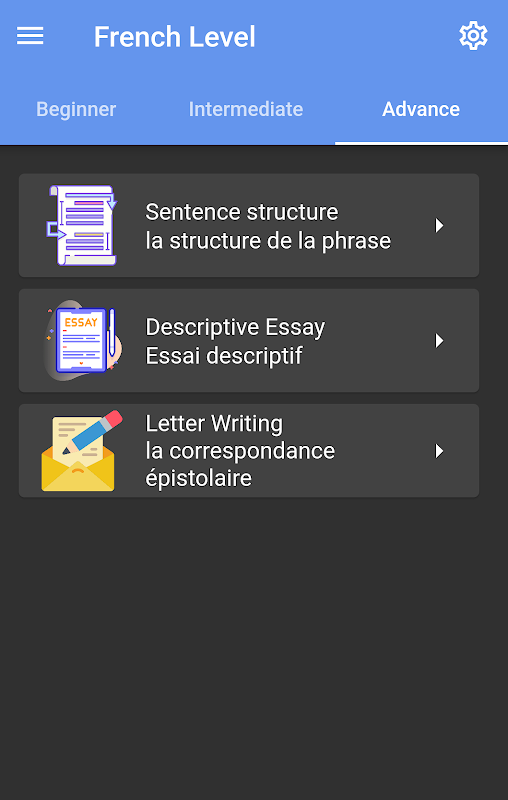 اعلی درجے کے سیکھنے والوں کے لیے، ہماری ایپ آپ کو اپنے فرانسیسی کو اگلے درجے تک لے جانے میں مدد کے لیے بہت سے چیلنجنگ موضوعات پیش کرتی ہے۔ جملے کی ساخت اور وضاحتی مضامین سے لے کر خط لکھنے تک، آپ کے پاس وہ ٹولز ہوں گے جن کی آپ کو فرانسیسی میں روانی سے اظہار کرنے کی ضرورت ہے۔
