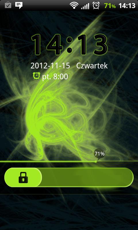 Lock the phone on and the screen shows a green tangle of lines. Takes us in the blink of the eye in space. From behind the green aurora emerging black depths of space living creature. He nods to me and invites you to walk through Milky Way. The initial fear subsides before curiosity. What is behind the green curtain of night? What unknown world? In the distance I hear the gentle sounds of panpipes. Where to put the invisible musician. I take a step into the dark and green aurora slides in front of me like a curtain in the theatre. I do not have wings but it brings me green dancing rhythm. I close my eyes and I move to a distant galaxy. I see a swirling green stars and flying at breakneck speed green comet. Someone dancing in a vortex of green ribbons, someone else plays the flute. Except to the extraordinary wallpaper with lime green cosmic form of life, there is also cool unlock slide bar in similar colors of green. The button has a small, cute padlock and all you need to do is tap the screen and slide to the right. In addition, just plug in the charger and Locker Future Theme will show you the battery level of your phone.