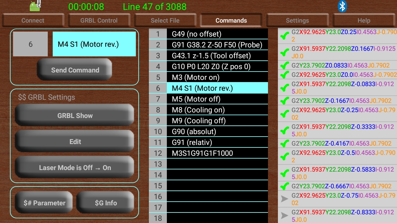 اس ایپ کے ذریعہ آپ اپنے GRBL CNC مشین کو اپنے 10 "گولی سے چل سکتے ہیں۔ یہ رابطہ بلوٹوتھ کے ذریعہ قائم ہوا ہے۔ ترجیحی وصول کنندہ ایک HC-06 ہے ، جسے 6 € سے بھی کم میں خریدا جاسکتا ہے۔ رابطے کی ہدایات مدد والے صفحات پر دستیاب ہیں۔ ایپ