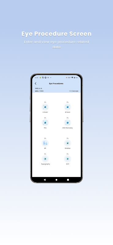 کسی بھی مریض کا پروفائل کھولنے کے لیے ان پر ٹیپ کریں۔ مریض کے پروفائل کے صفحے پر، آپ کو مریض کی تفصیلات اور دو اختیارات نظر آئیں گے: آپٹومیٹری اور آئی پروسیجرز۔