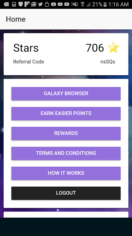 Galaxy Browser is dedicated to helping you get rewarded for performing tasks that you normally do! With Galaxy Browser, you simply surf the internet and get rewarded! Go on social media, online shop, study, or do whatever you would normally do online, all while earning stars which can be put toward rewards! These stars can be put toward sweepstakes, gift cards, or physical products! Use your referral code to get 50% of whoever you refer's stars! For every 2 stars they earn, you'll earn a point! It's that simple!