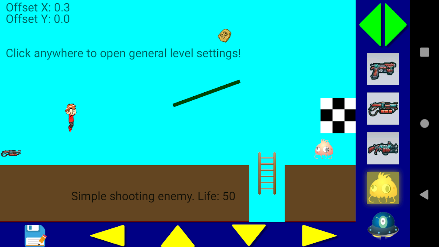 مشہور box2d فزکس انجن کی بنیاد پر، گیم لیول میکر 2 آپ کو حقیقت پسندانہ ٹھوس جسمانی تعاملات کے ساتھ 2d لیول بنانے کے قابل بناتا ہے: پلیٹ فارم، سیڑھی، چننے کے قابل اشیاء اور یقیناً دشمن!