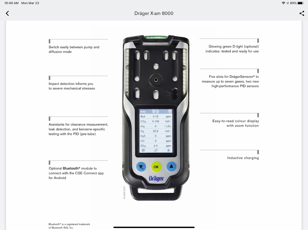 ڈریگر گیس کا پتہ لگانے والا ایپ گیس اور بخار کی پیمائش کی ٹیکنالوجی کا عمومی جائزہ پیش کرتا ہے۔ ڈریگر ٹیوب ، ڈریگر سینسر اور ڈریگر چپ پیمائش کے نظام کے بنیادی اصول بیان کیے گئے ہیں اور ڈوجر-نلیاں اور چپس کی ایک مکمل فہرست سازی پیمائش کے متعلقہ تمام پیرامیٹرز کے ساتھ فراہم کی گئی ہے۔ اس کے علاوہ ، پورٹ ایبل مانیٹروں کا تعارف موجود ہے ، جس میں الیکٹرو کیمیکل ، کیٹلیٹک ، اور اورکت سینسر ٹکنالوجی شامل ہے ، اسی طرح ڈوجر سینسرز اور مانیٹر کی مکمل فہرست بھی شامل ہے۔ سپورٹ سیکشن میں سینسر مطابقت چارٹ ، کس طرح ویڈیوز ، غلطی کوڈ چارٹ اور ہمارے نئے کسٹمر سپورٹ پیجز کے لنکس شامل ہیں۔