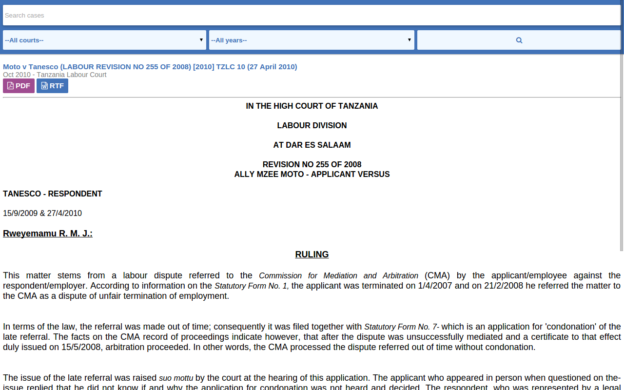 Our legal library makes it easy for you to find Tanzania court case documents. You get access to case files from the Tanzania High Court, Tanzania Court of Appeal and Tanzania Labour Court, dating back from 1986 in PDF or RTF format.