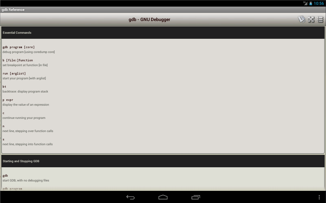Intended for programmers that use the GNU debugger, this App is a reference of common features in gdb version 4. Content is organized into following sections: