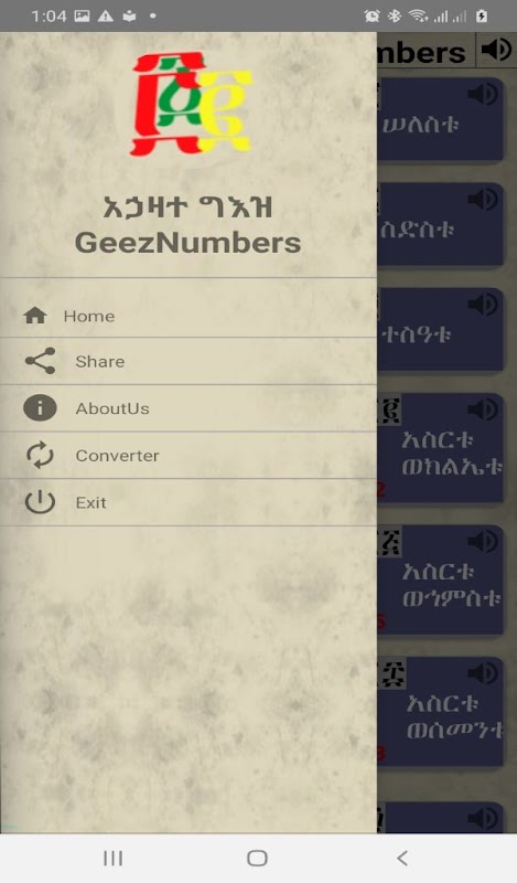 መተግበርያ የ ግእዝን አኃዛት አኃዛት የተሰራ የተሰራ ሲሆን ድምጽ ድምጽ ጽሁፍ ጽሁፍ የ۔ ማንኛዉንም የ ግእዝ አኃዝ ወደ ኢንቲጀር (ኢንቲጀር) መቀየርያ ና ማንኛዉንም የ ኢንቲጀር (ኢንቲጀር) ወደ ግእዝ አኃዝ መቀየርያ አካቷል